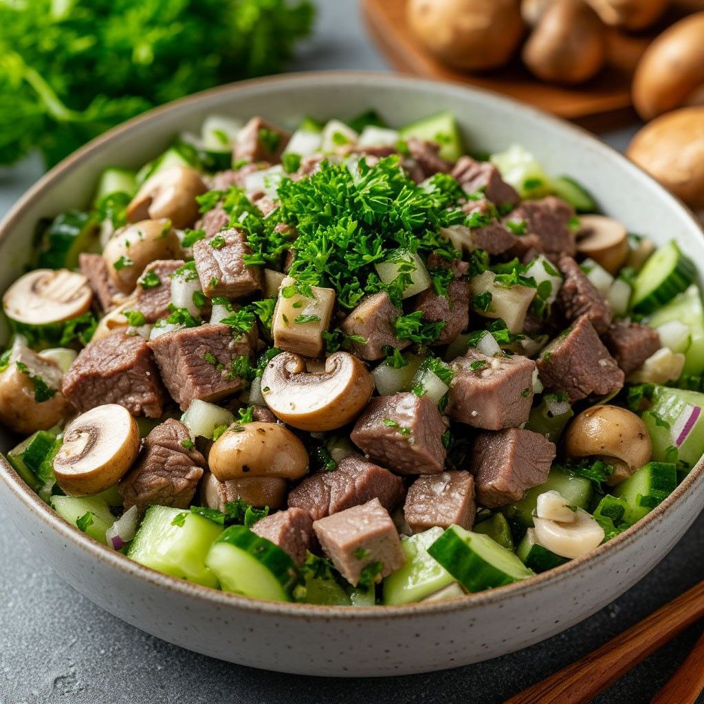 Salade avec langue, concombres et champignons